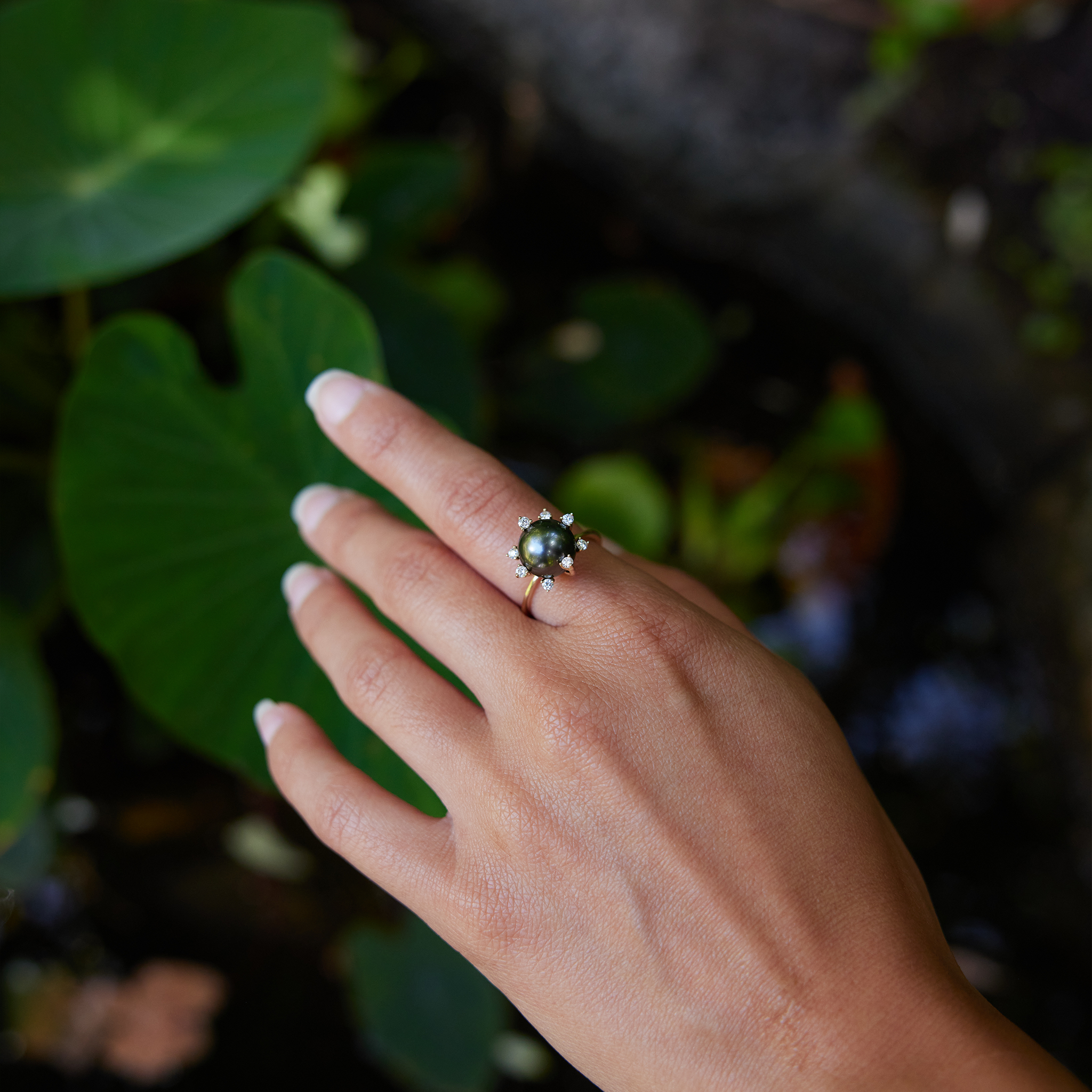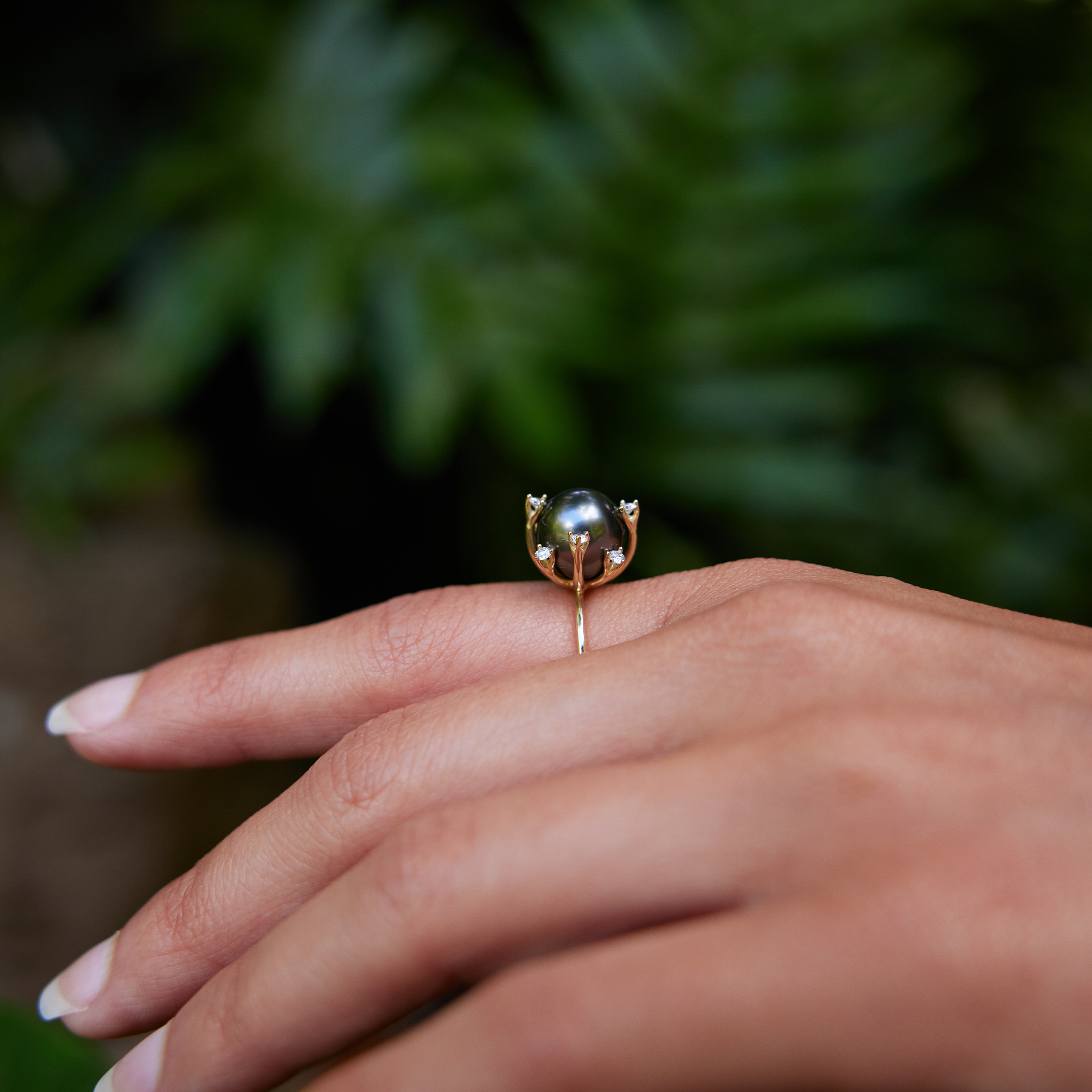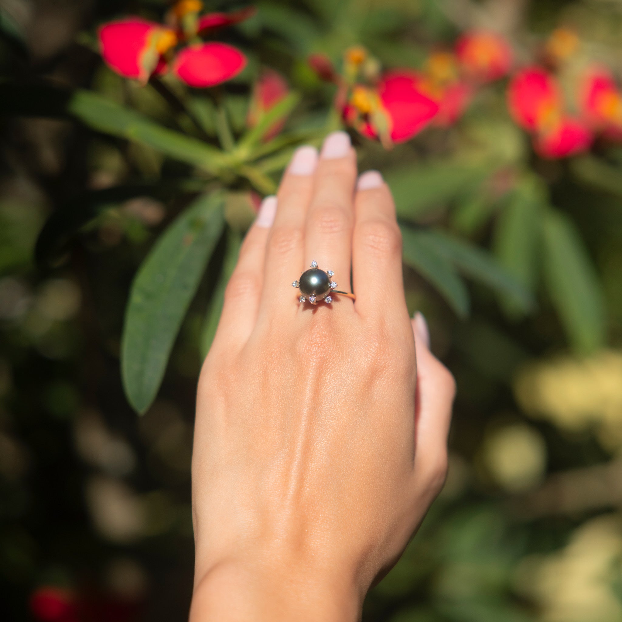 ダイヤモンドと金のプロテアタヒチアン黒真珠のリング - 10-11mm