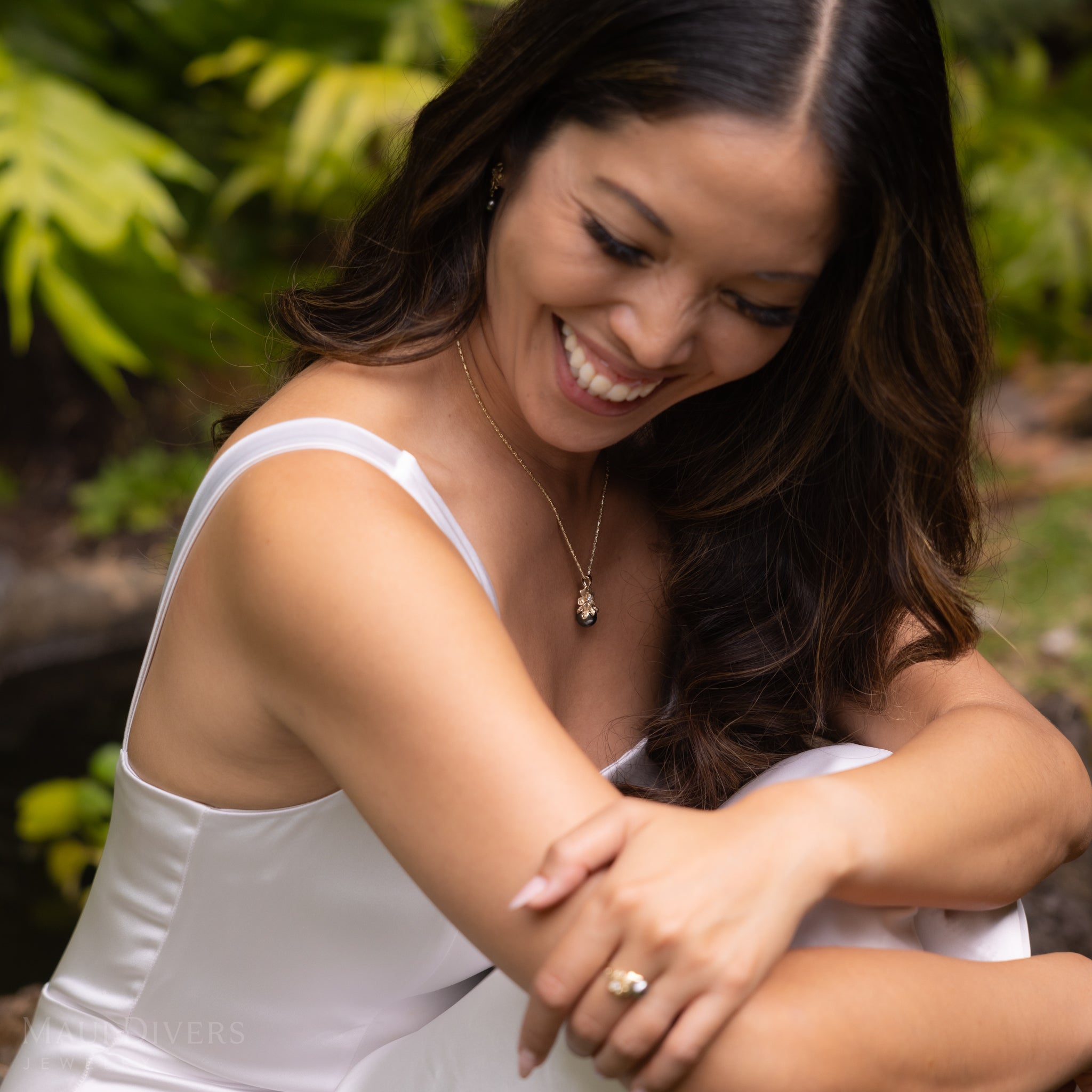 ナウペンダントは、魅力的なハワイ原産のガーデニアからインスピレーションを得ています。ペンダントは、ダイヤモンドのアクセントと光沢のあるタヒチ産ブラックパールを包む光沢のあるサテン仕上げのガーデニアと高光沢の葉が特徴です。ナーウはあなたの顔に優しい笑顔をもたらします。 Nāʻū は良い知らせとあなたを満たす幸福をもたらす人を表します。