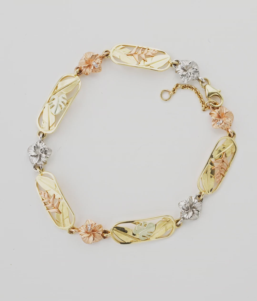 Adjustable 7.25-8.25" Hawaiian Gardens Hibiscus Bracelet in Four Tone Gold with Diamonds
