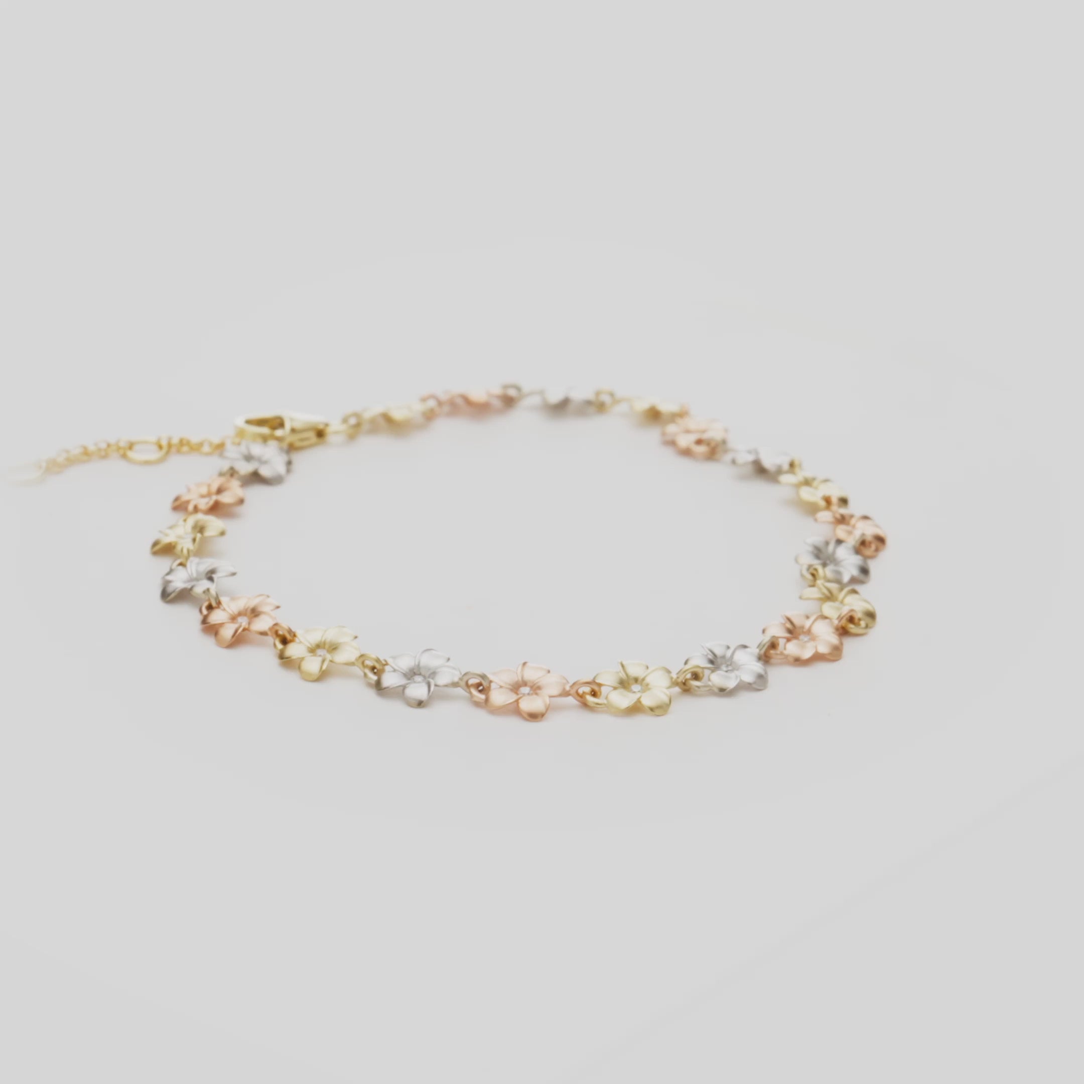 7-8.5" Adjustable Plumeria Bracelet in Tri Color Gold with Diamonds - 6mm
