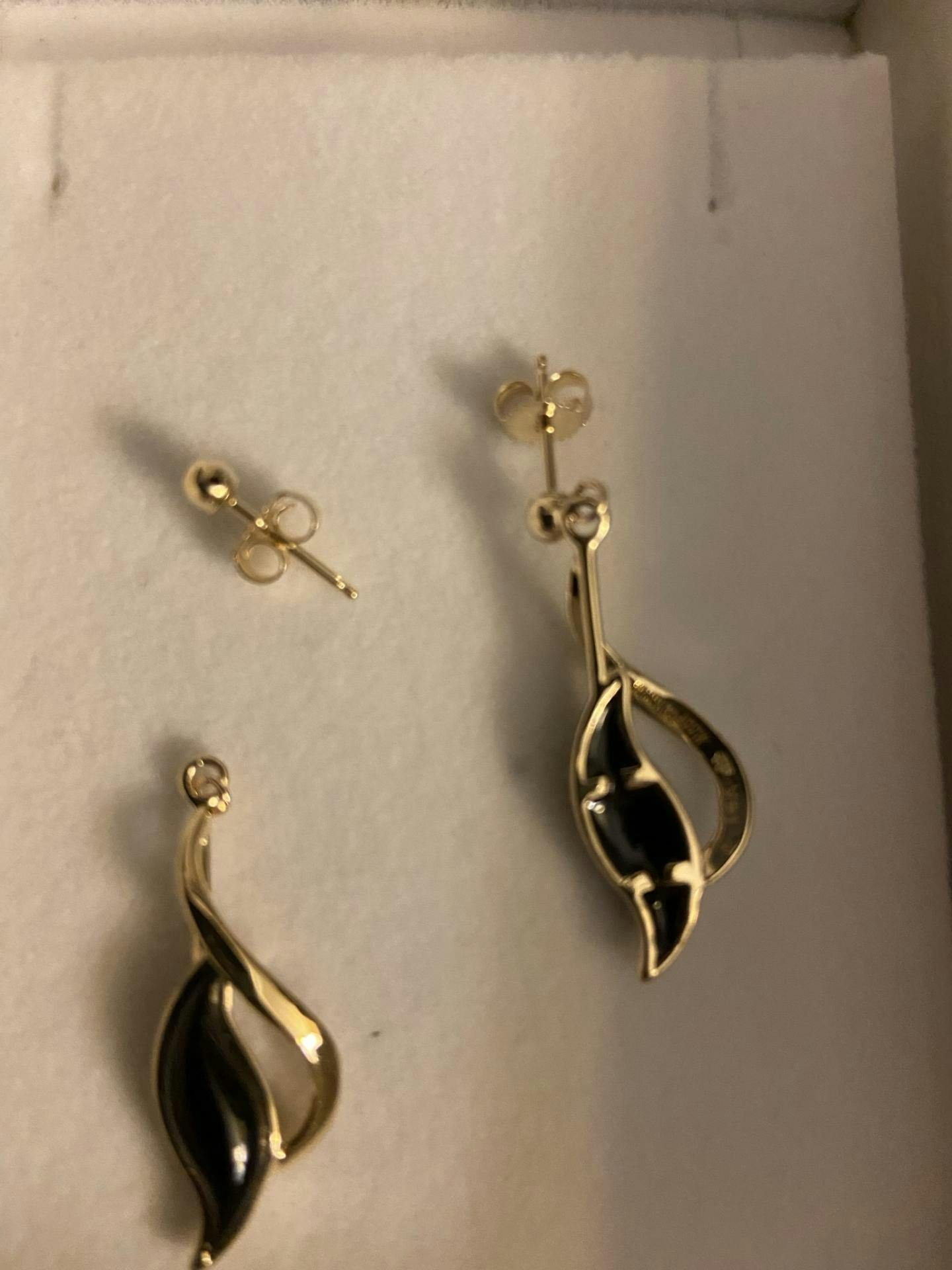 The Paradise Earrings in solid 14k gold feature a dramatic dangling design with lustrous Hawaiian black coral inlay contrasting classic high-polish yellow gold.