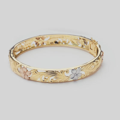 Hawaiian Heirloom Plumeria Hinge Bracelet in Tri Color Gold - 10mm