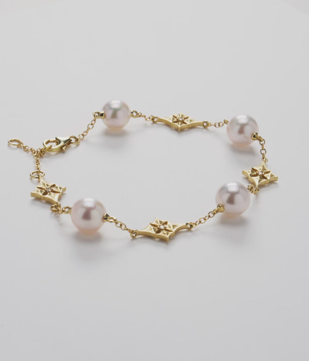 7-8" Hawaiian Quilted Star Akoya White Pearl Bracelet in Gold with Diamonds - 8mm