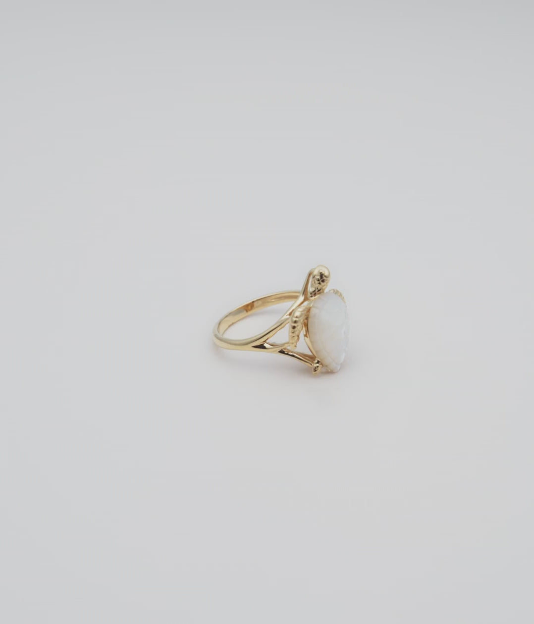 Display this glowing mother of pearl ring in all its natural beauty with a loving Honu (Sea Turtle) design. Crafted in 14k yellow gold, this ring features a delicately carved mother of pearl that will leave you breathless.