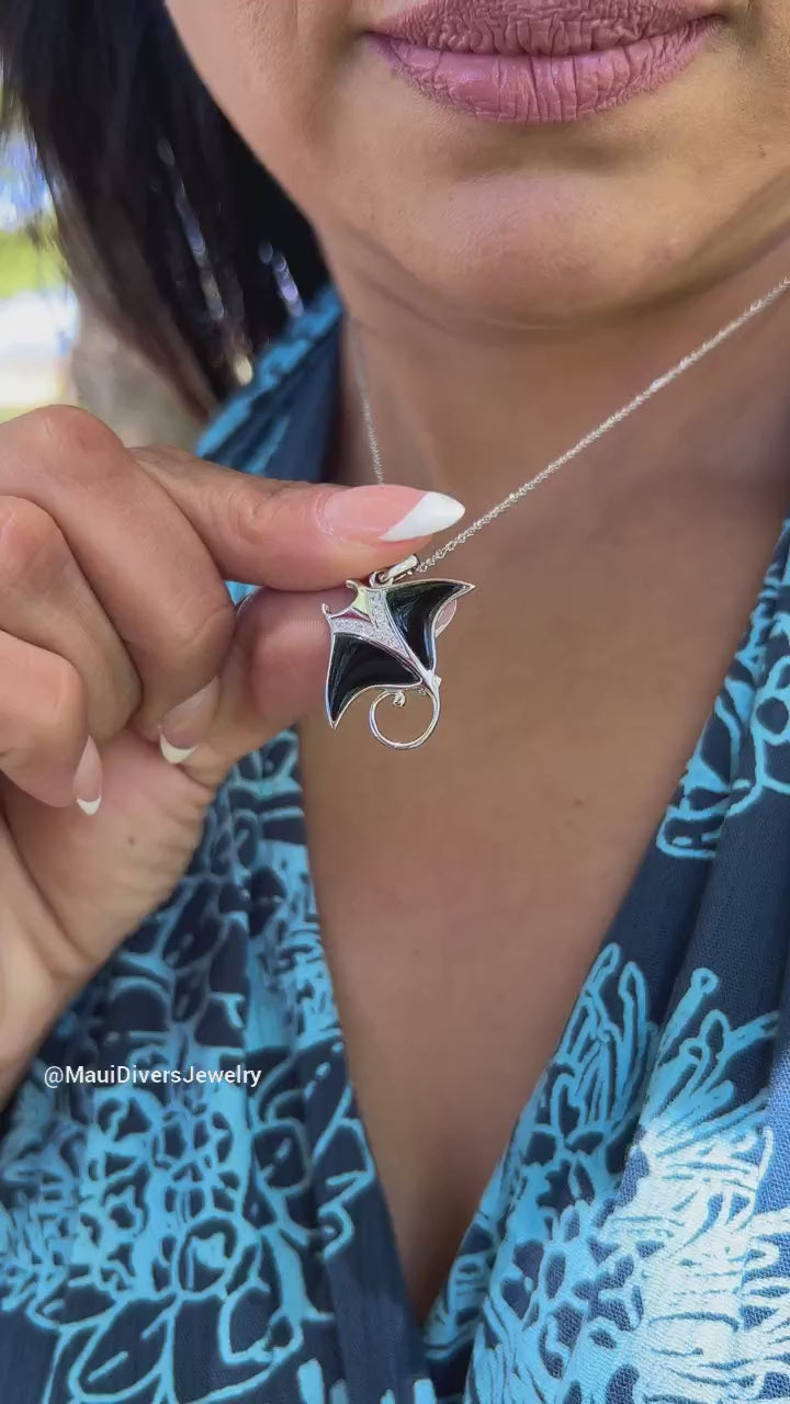 The Manta Ray Pendant from our Sealife Collection features the stunningly lustrous Hawaiʻi state gem, black coral, diamond, and gold. Locally made in Hawaiʻi, this Manta Ray Pendant is a perfect way to commemorate your trip to Maui.