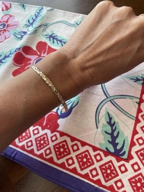 The Hawaiian Heirloom Bracelet in solid 14k yellow gold features elegant old English style Hawaiian Heirloom scrollwork with maile leaves and ferns. A symbol of love, honor, and respect, this bracelet is a meaningful keepsake you'll pass down for generations.
