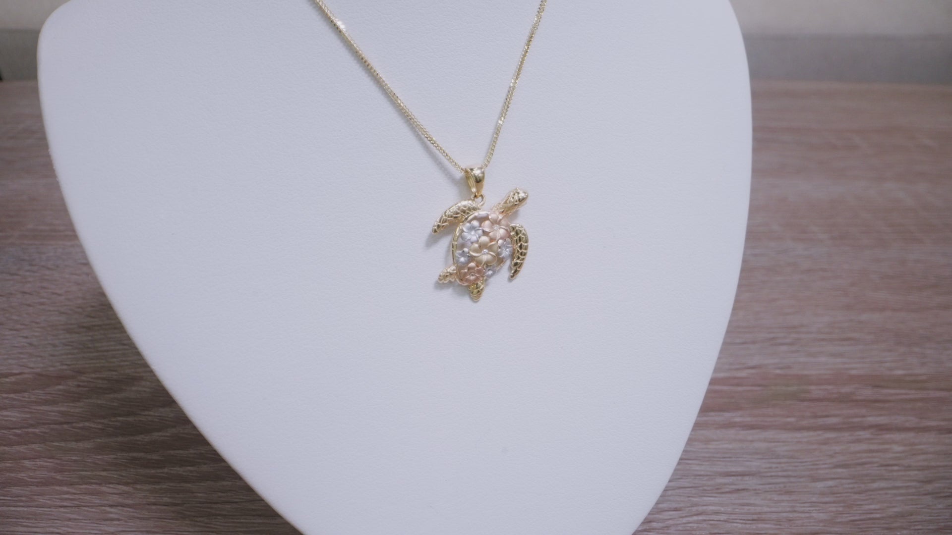 Hawai'i's favorite flower and sea animal are beautifully joined with the Plumeria Honu (Sea Turtle) Pendant. Crafted in a bouquet of tri color gold plumerias for the shell and complementing gold for the sea turtle's outer body, this charming piece will be a delightful talking point as your share your fond memories of Hawaiʻi.