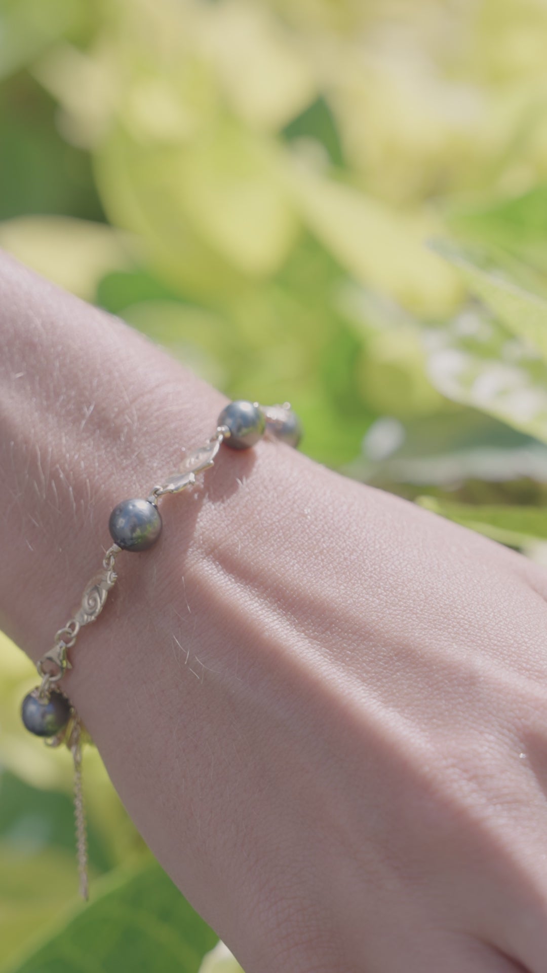 The Seashells Bracelet features Native Hawaiian seashells in solid 14k yellow gold and lustrous Tahitian black pearls with blue and green overtones. Easily adjust the length to your preference and showcase this stunning made in Hawaiʻi keepsake with pride.