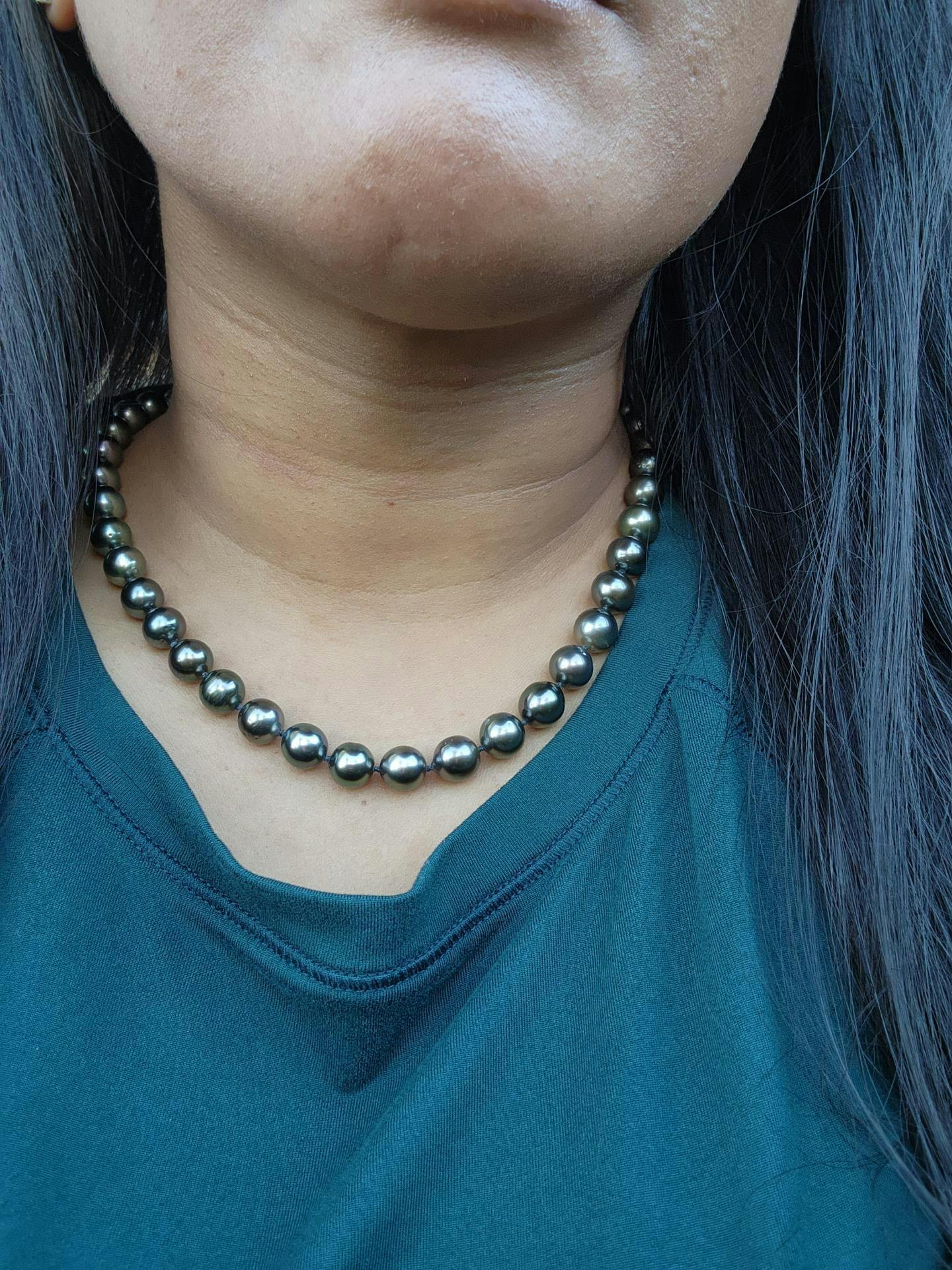 Experience the elegance of a fully knotted strand featuring graduated 10-11mm Tahitian black pearls in a stunning array of natural colors. Secured with an elegant 14k yellow gold clasp, this strand measures approximately 17-18 inches, making it the perfect statement piece to elevate any outfit.